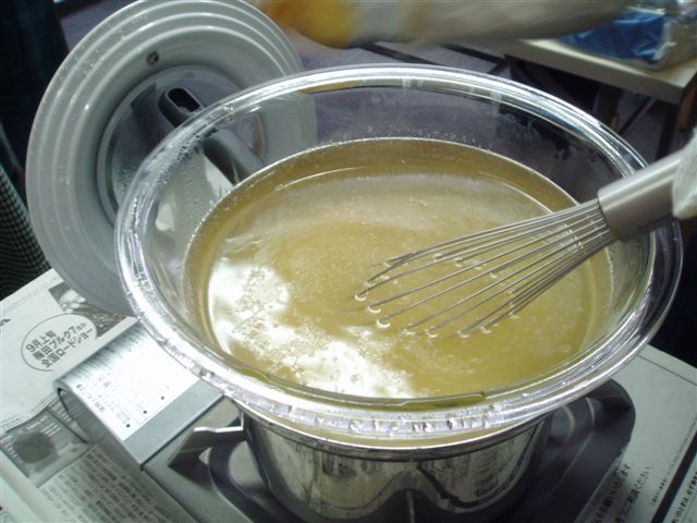 將皂液放到熱鍋上去蒸,從這開始才是真正的進行皂化~
